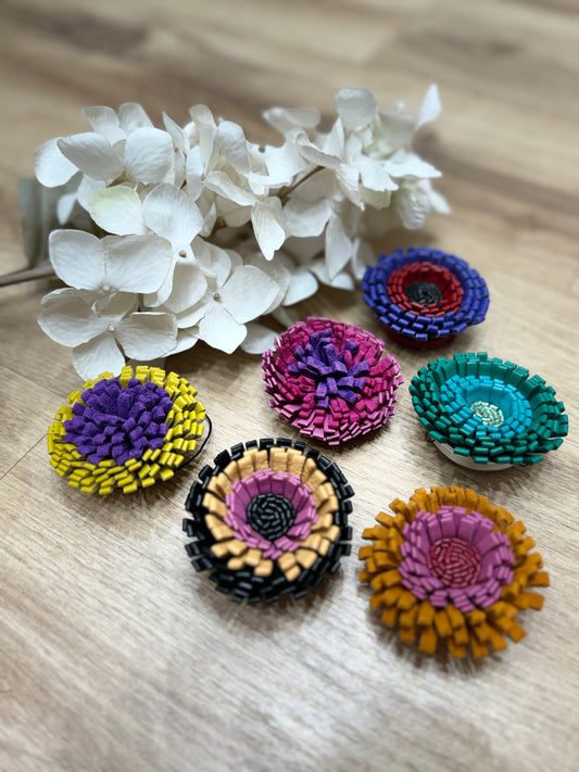 Spilla Fiore Artigianale In Pelle Italiana, Arancio, Lilla, Oro - Dimensioni 6/8 Cm, Ottone Nichel Free